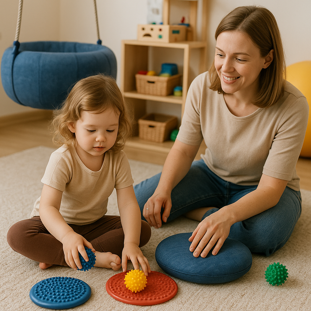 • 풍부한 감각 자극 환경: 집안에 다양한 질감의 물건, 소리 나는 장난감, 움직임이 가능한 공간 등을 마련하여 아이가 자유롭게 감각을 탐색할 수 있도록 돕습니다.